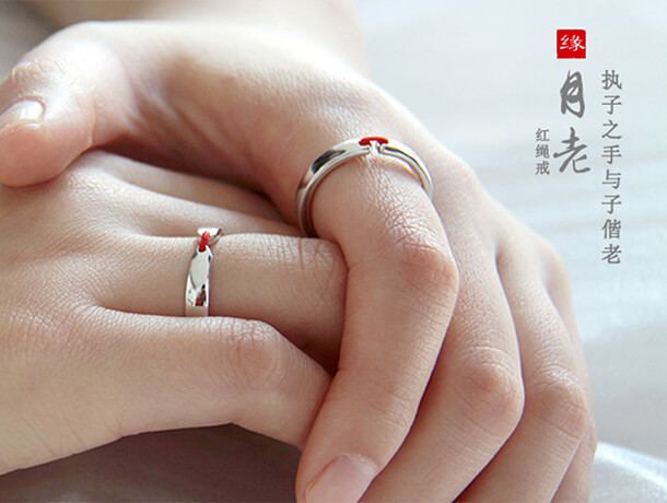 一说到月老传,就联想起最具中国代表性的中山装与旗袍盘扣元素,设计师将925纯银和红绳连接后,这两种不同属性的素材发生碰撞便融合成优雅简约的月老红绳对戒了。