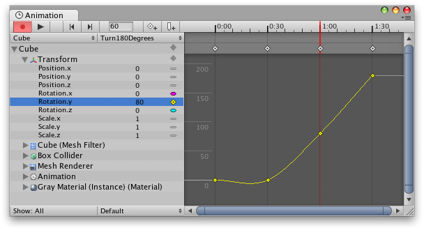 关键帧按钮(KeyFrame Button)会为当前预览的帧所显示的曲线创建一个关键帧(快捷键:K)。You can also manually create a keyframe using the Keyframe button. This will create a key for all the curves that are currently shown in the Animation View. If you want to only show curves for a subset of the properties in the property list, you can select those properties. This is useful for selectively adding keys to specific properties only.您可以通过使用"关键帧"按钮手动创建一个关键帧。这将会为动画视图中所有的曲线创建一个键值。如果您只想看到属性列表中的一小部分属性的动画曲线,您可以选择那些属性。这非常适用于选择性地为某一些属性添加键值。
